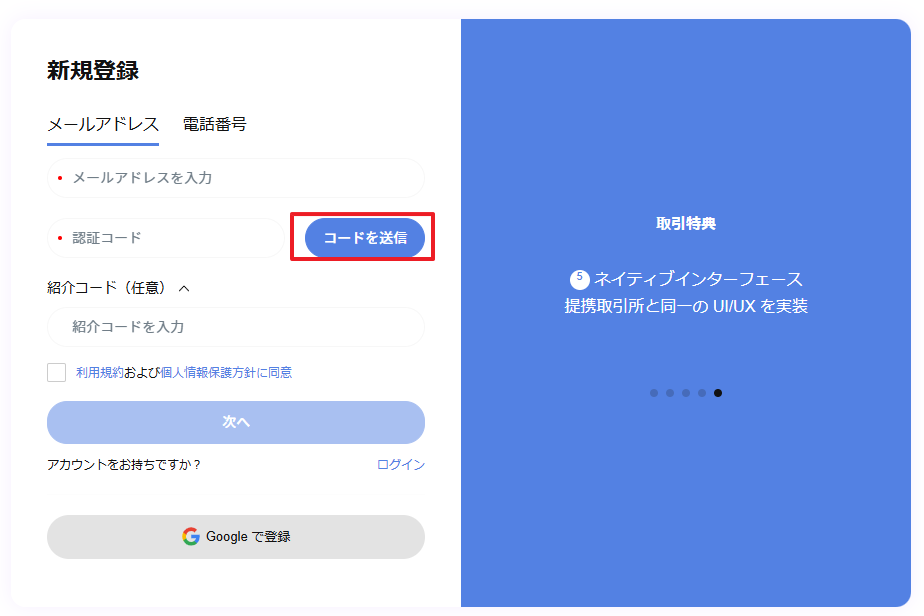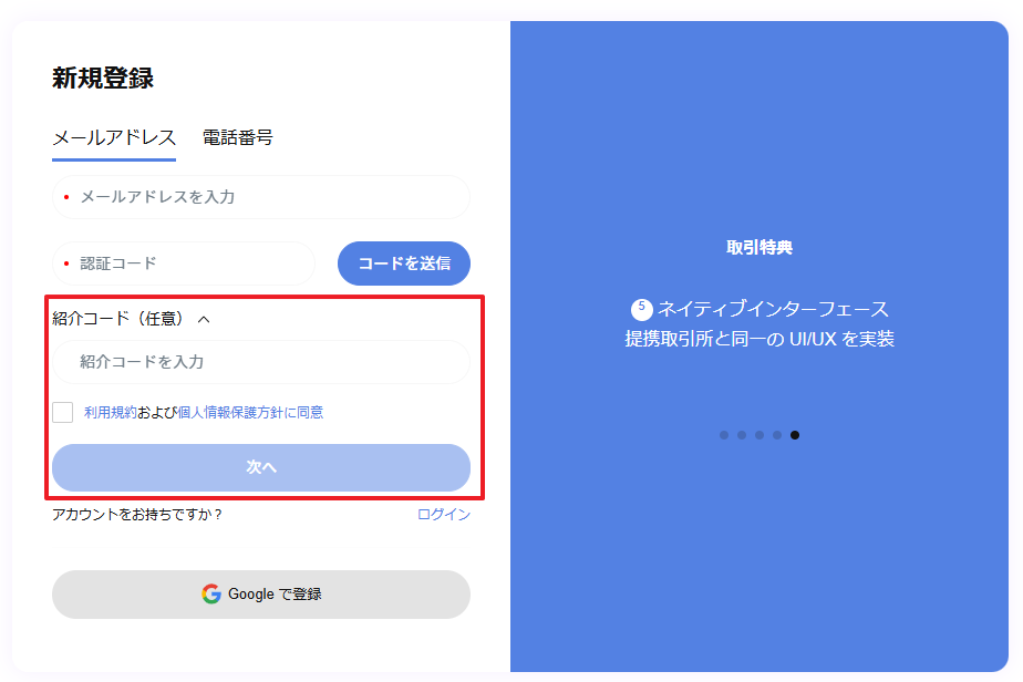 紹介者を通じてSEVIXに登録した場合、「紹介コード(任意)」欄に紹介者のコードを入力します。