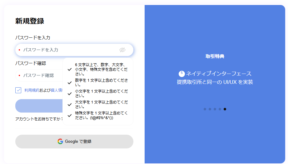 条件に合ったパスワードを設定します。英字、数字、特殊文字を含む6文字以上のパスワードを入力します。例: !@#$%^&*()