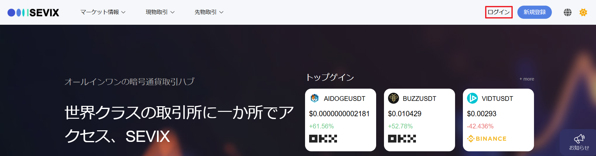 【ステップ1】SEVIXのウェブサイトにアクセスし、右上の「ログイン」ボタンをクリックしてください。