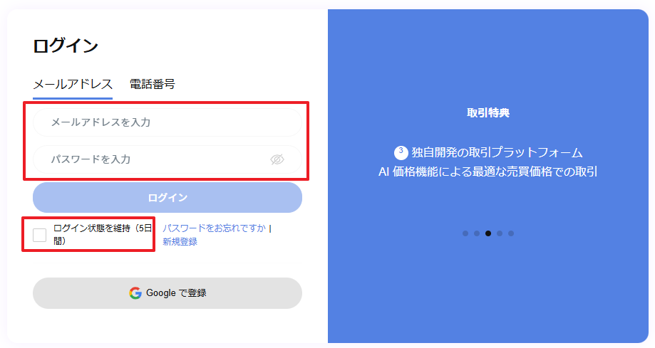 - 会員登録時に使用したメールアドレスまたは携帯電話番号とパスワードを入力します。