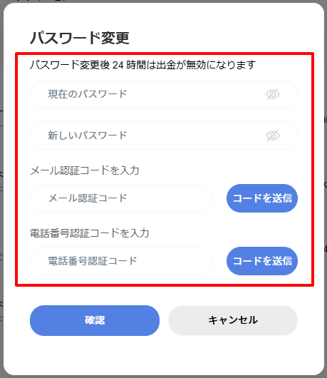 !! セキュリティ上の理由により、パスワードを変更した後、24時間は出金機能が無効となります。
