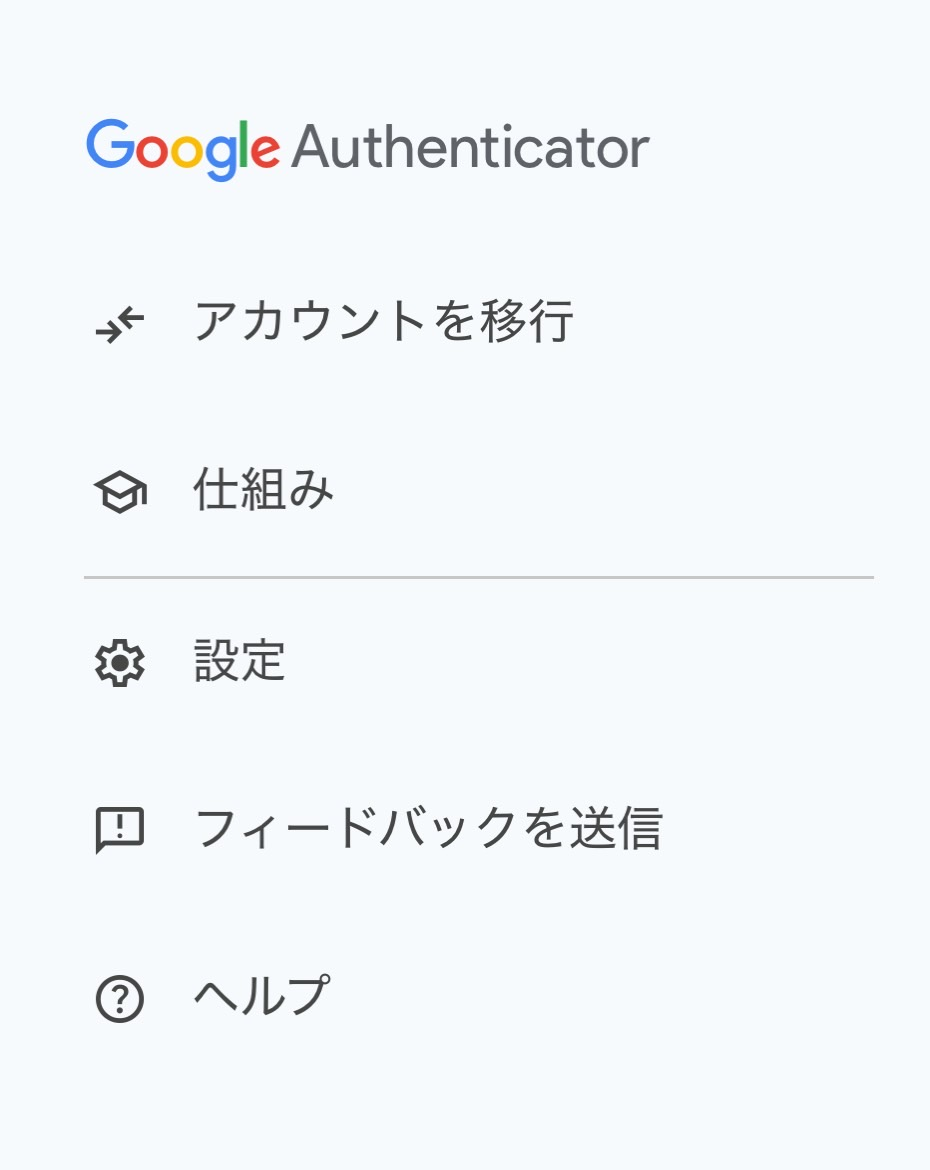 従来の携帯電話でGoogle OTP(Google Authenticator)を開き、左上にあるメニューバー(三)アイコンをタップしてください。