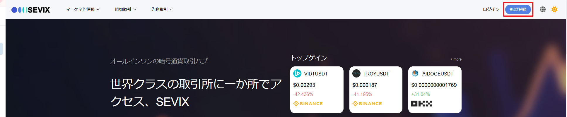 【ステップ1】SEVIXのウェブサイトにアクセスし、右上の「会員登録」ボタンをクリックしてください。